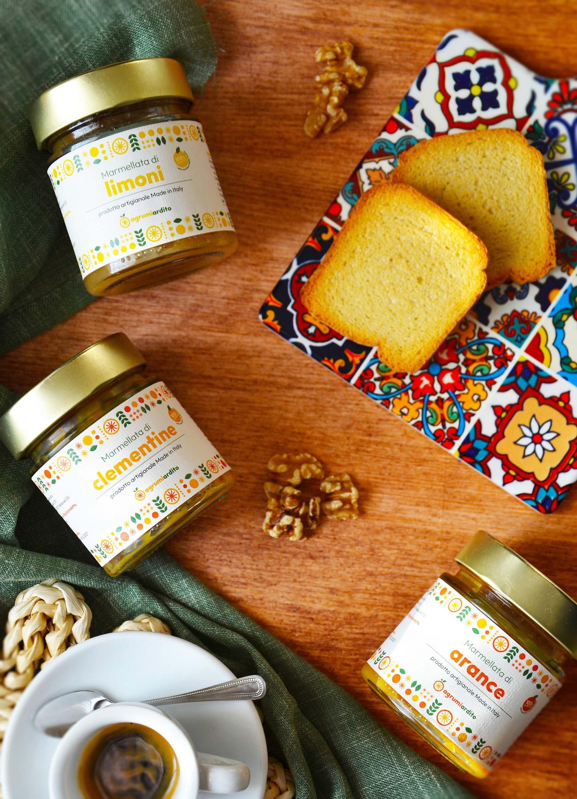 Le marmellate sono prodotte con il desiderio di offrirti un'esperienza gastronomica straordinaria. Sperimenta la freschezza e l'autenticità dei nostri agrumi italiani in ogni morso, e lasciati trasportare dalle note aromatiche di Clementine, Arance e Limoni.